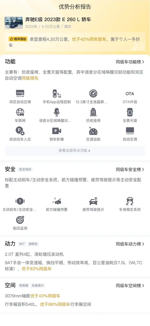 在豪华中级车领域,奔驰E级2023款以其品牌影响力、宽敞舒适的乘坐体验、强劲且节能的动力性能以及丰富的智能科技配置,使得其市场竞争力显著。这款车以其卓越的品质和良好的用户口碑,赢得了市场的广泛认可和好评。数据显示,这款车在二手车市场也很受欢迎,价格相对稳定,显示出良好的保值能力。当然每辆二手车的状况都不一样,具体还要结合车辆实际情况来看。