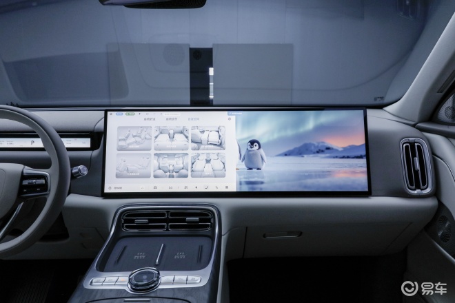 内饰方面,新车配备了12.66英寸长条内嵌样式的全液晶仪表盘,并搭配双色三辐式多功能方向盘。中控中间配备了与副驾相连通的30英寸贯穿多媒体触控屏,中控台通道区域则安置了双无线充电面板以及部分物理功能按键和旋钮。