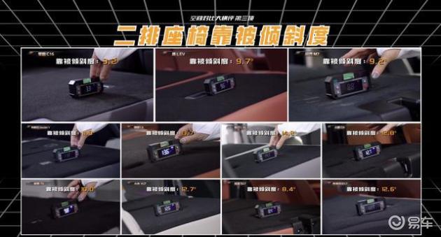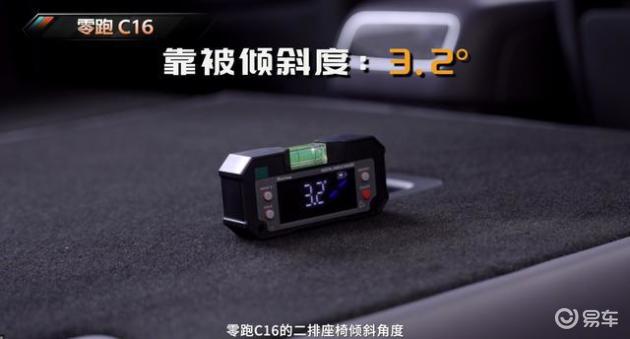 最后一项测试是二排座椅放倒后的平整度,更纯平的二排空间可以带来更舒适的躺平体验。实测数据显示,零跑C16的倾斜度仅为3.2度,与其他10款车型拉开差距,从视觉上看几乎纯平。