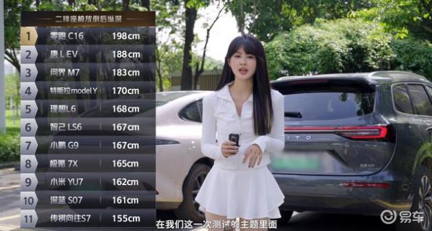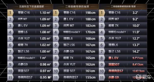 该媒体围绕装载能力和户外出游时后排座椅放倒后的舒适性,对后备厢面积、二排座椅放倒后的纵深、二排座椅靠背倾斜度和落差等进行了实测。本次参与实测的车型涵盖了市面上主流的大尺寸SUV,分别是零跑C16、比亚迪唐L EV、理想L6、问界M7、极氪7X、智己LS6、小米YU7、特斯拉Model Y、小鹏G9、广汽传祺向往S7和深蓝S07,共计11款车型。因此,这次的对比不仅具有看点,也具备实际意义。接下来,我们将逐一解析。