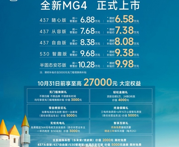 2025成都车展,全新MG4上市,共推出5款车型,售价区间为6.88-10.28万,限时补贴价6.58-9.98万。新车定位全新紧凑型车。