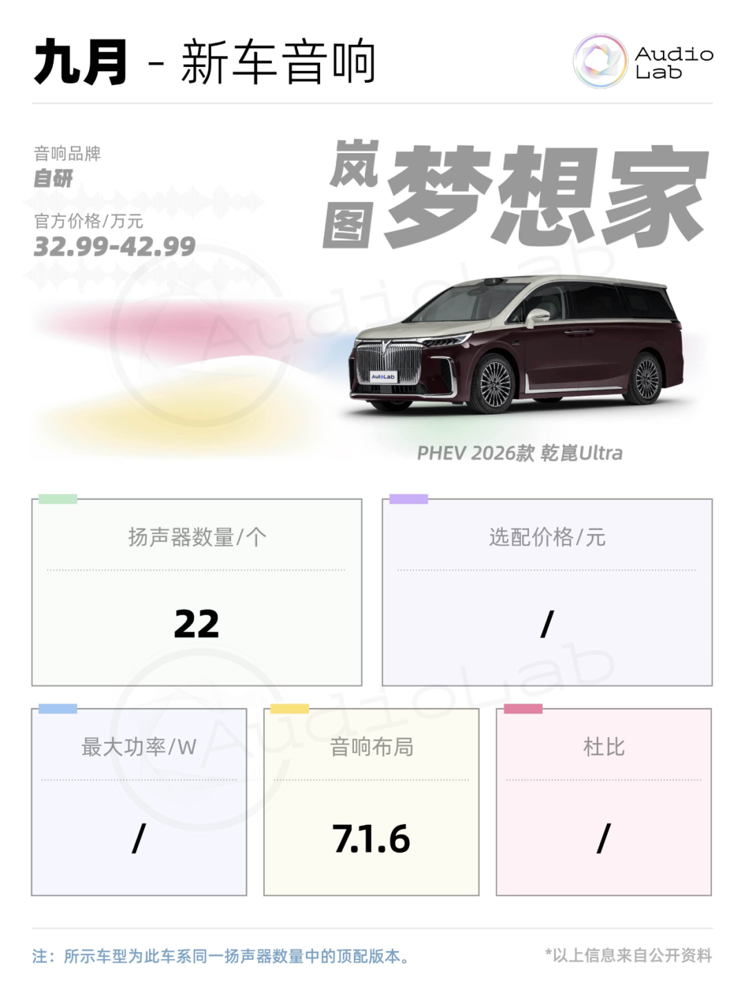 2025款岚图梦想家的音响布局是7.1.6,独特之处在于为第三排乘客专门设置了两个天空声道,比常见的 7.1.4 全景声多了两个声道。