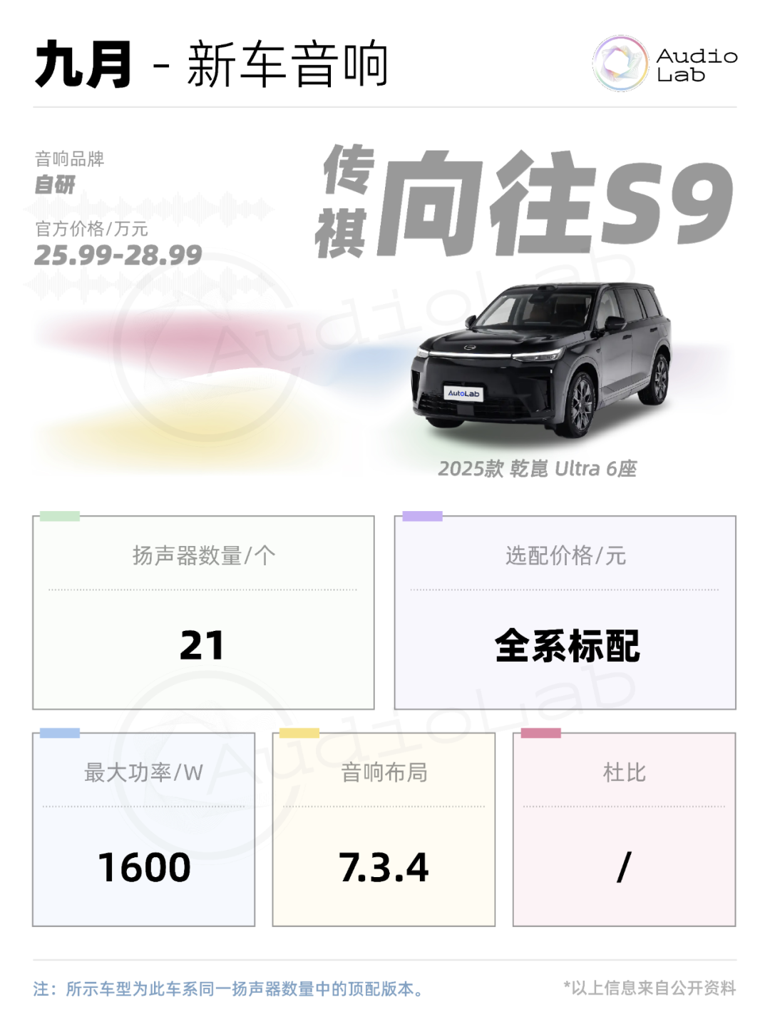 除了顶配搭载22个扬声器,其他版本均搭载20个扬声器,也并没有提供选装。