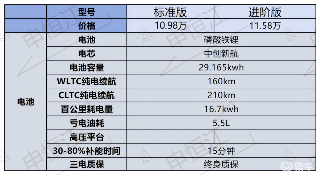 中创新航的磷酸铁锂电池,电池容量29度,WLTC纯电续航160公里、CLTC纯电续航210公里,百公里耗电量16.7度,亏电油耗5.5升,提供快充,但功率不知道,30%-80%补能时间为15分钟,三电质保为终生。i60改提供一个因为质量问题导致自燃,一赔三。