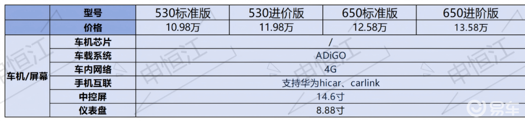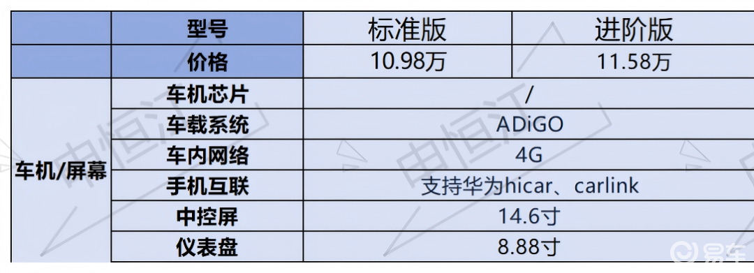 车机芯片不知,车载系统为ADiGO,车内网络为4G,支持华为hicar和carlink手机互联,中控屏为14.6寸,仪表盘为8.88寸。