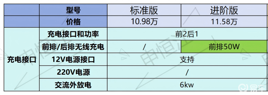 充电接口前2后1,只有进阶版提供前排50瓦无线充电,全系标配12V电源接口,支持外放电(6kw)。