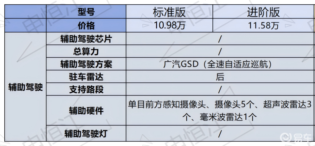 标准版只支持全速自适应巡航,只有进阶版才支持广汽GSD智驾,还支持智驾小蓝灯。并且比标准版多了一个前驻车雷达。