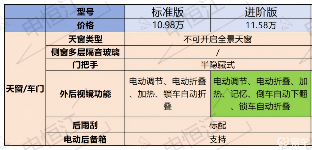 低配没有天窗,全系半隐藏式机械门把手,外后视镜功能方面:进阶版比标准版多了两个记忆和倒车自动下翻功能。支持后雨刮,低配没有电动后备箱。