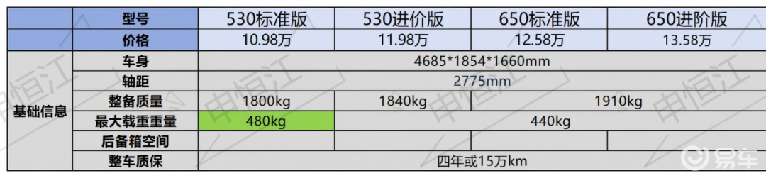 车身4685×1854×1660mm,轴距2775mm,空车重量在1800-1910kg,最大载重重量440-480kg,后备箱空间是416升,官方宣传图上面标注的。提供一个四年或15万公里的整车质保。