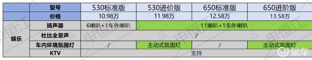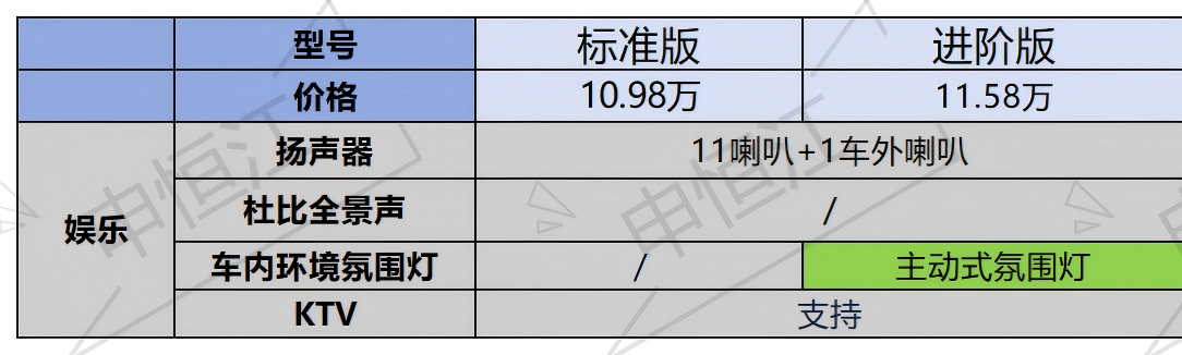 低配为6喇叭+1车外喇叭,其他配置均为11喇叭+1车外喇叭。只有进阶版才有主动式氛围灯,氛围灯颜色不知道多少色。全系标配KTV模式。