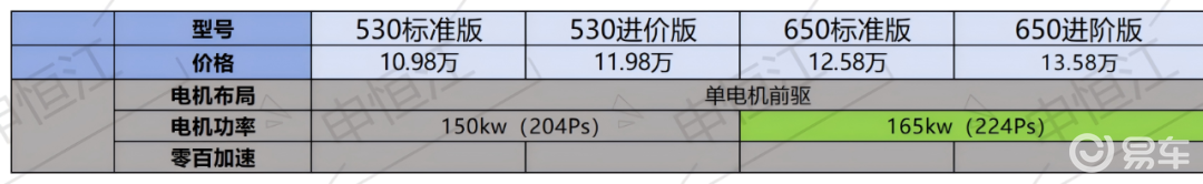 单电机前驱,530版本电机功率为150kw(204Ps)、650版本电机功率为165kw(224Ps)。