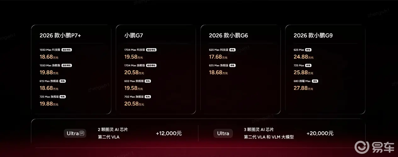 定价方面,2026款小鹏P7+ 提供超级增程和纯电两种动力形式,超级增程有1550 Max 科技版和1550 Max 旗舰版,官方指导售价为18.68万元和19.88万元;纯电有615 Max旗舰版和725 Max 旗舰版,官方指导售价为18.68万元和19.88万元。2026款小鹏G7推出四个版本,超级增程1704 Max 科技版和1704 Max 旗舰版,官方指导售价为19.58万元和20.58万元;纯电602 Max 旗舰版和702 Max 旗舰版,官方指导售价为19.58万元和20.58万元。2026 款小鹏 G6推出纯电625 Max 科技版和625 Max 旗舰版,官方指导售价为17.68万元和18.68万元。2026 款小鹏 G9推出纯电625Max、725 Max和680 四驱Max版,官方指导售价为24.88万元、25.88万元和27.88万元。