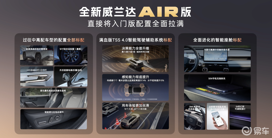 看到这,有些朋友肯定会质疑了,合资车的最低配谁买得下手?按以往来说确实如此,但威兰达AIR版是个例外,主驾驶10向电调、皮质座椅、满血版TSS 4.0驾驶辅助、14英寸屏幕+智能车机、50W无线充电、氛围灯、手机数字钥匙,通通给你标配了。这些曾经在丰田中配车型上都不敢奢望的配置,如今全系标配,老车主们不知道会不会馋哭了。所以按照广汽丰田的话术来形容就是:起步即高配。