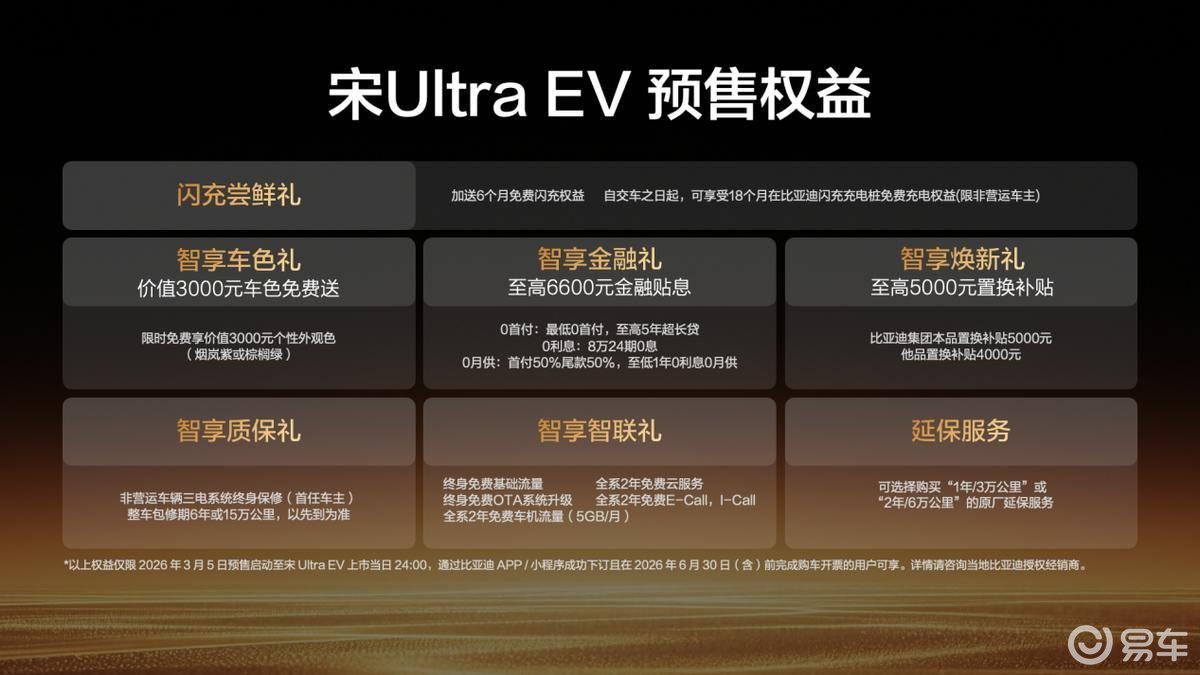 2026年3月5日,比亚迪王朝B级闪充SUV 宋Ultra EV正式开启预售,全系搭载比亚迪第二代刀片电池及闪充技术,同时配备多项奢适配置。新车预售价15.5-18.5万元。同时,预订用户还将享受整整18个月免费闪充权益。