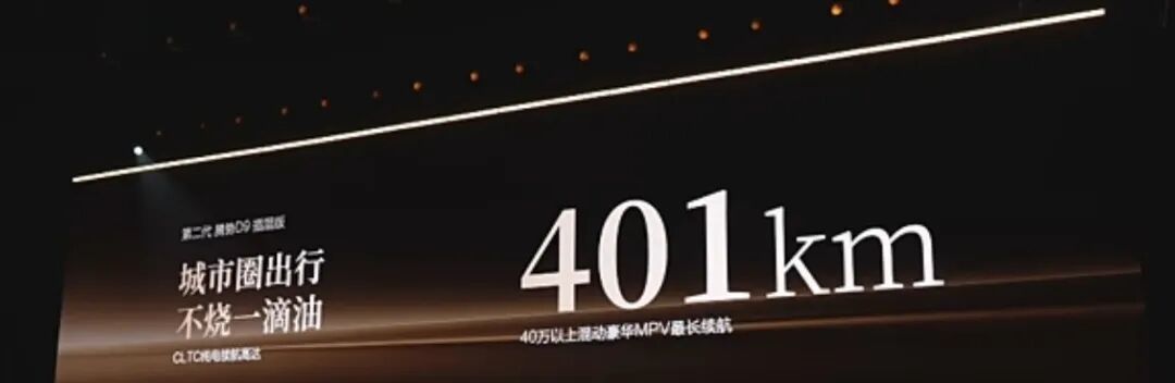 二代腾势D9虽然没这么长,但这次官方公布的纯电版续航是800公里,也不短了。插混版的CLTC纯电续航401公里。