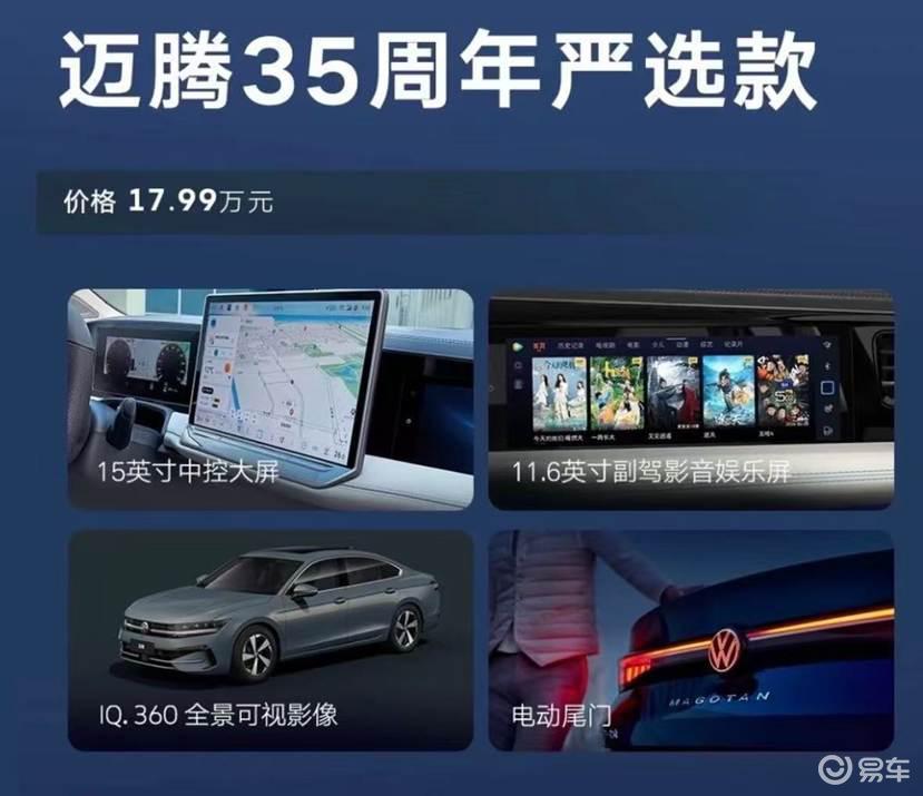 为纪念品牌35周年,家族的传奇车型迈腾35周年严选款同步上市,售价17.99万元,凭借超高性价比重塑中型轿车市场标杆。新车延续迈腾经典的商务与家用双重属性,保留德系精湛工艺与宽敞空间,以亲民价格满足消费者对高品质中型轿车的需求。