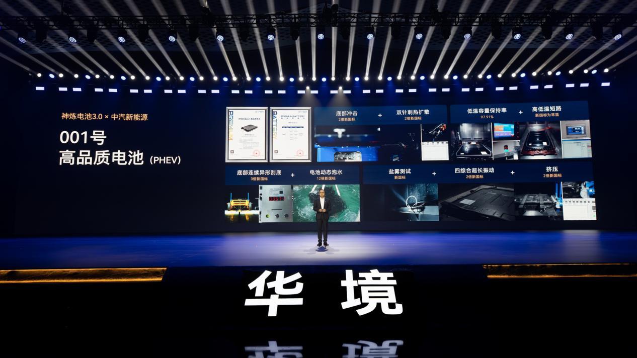 电池达到PPB(十亿分之一)航空级制造标准。极限验证中,裸电芯硬抗1500J底部撞击(新国标要求150J),不起火不爆炸;还通过了超越新国标的四大串行测试。最终获得中汽新能源001号(PHEV)高品质电池验证证书。