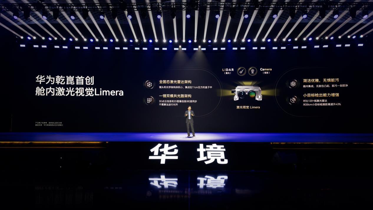 华境S的智能驾驶全系标配华为乾崑智驾ADS Pro增强版。一个关键创新是首批搭载舱内激光视觉Limera——把激光雷达放在驾驶舱内后视镜附近,而不是车顶。好处是外观更整洁,且不易被污损。更重要的是,Limera对小目标障碍物的检出能力更强。