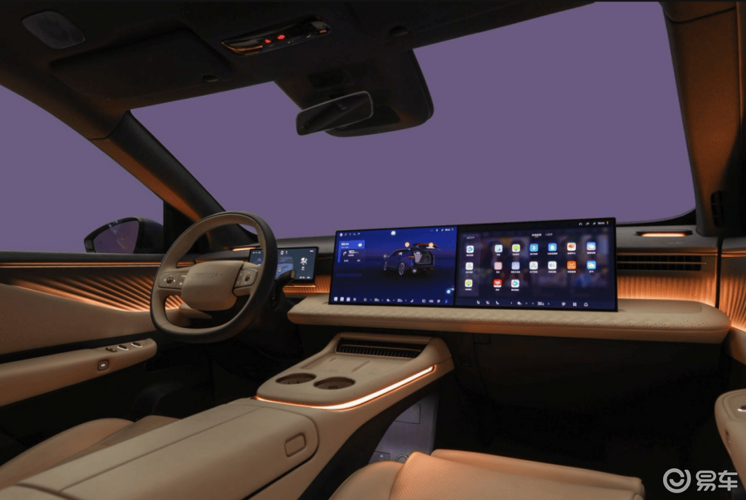 内饰方面,采用大尺寸悬浮式中控屏,全系标配高通骁龙8155芯片,还配备50W无线充电面板和256色音律氛围灯。
